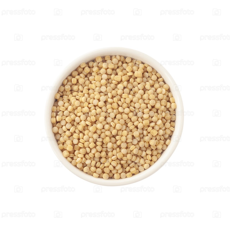 Вид сверху на сырую паста ptitim в круглой тарелке, изолированной на белом фоне