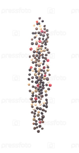 Целые черные, белые, зеленые и розовые перцовые зерна падают и изолируются на белом