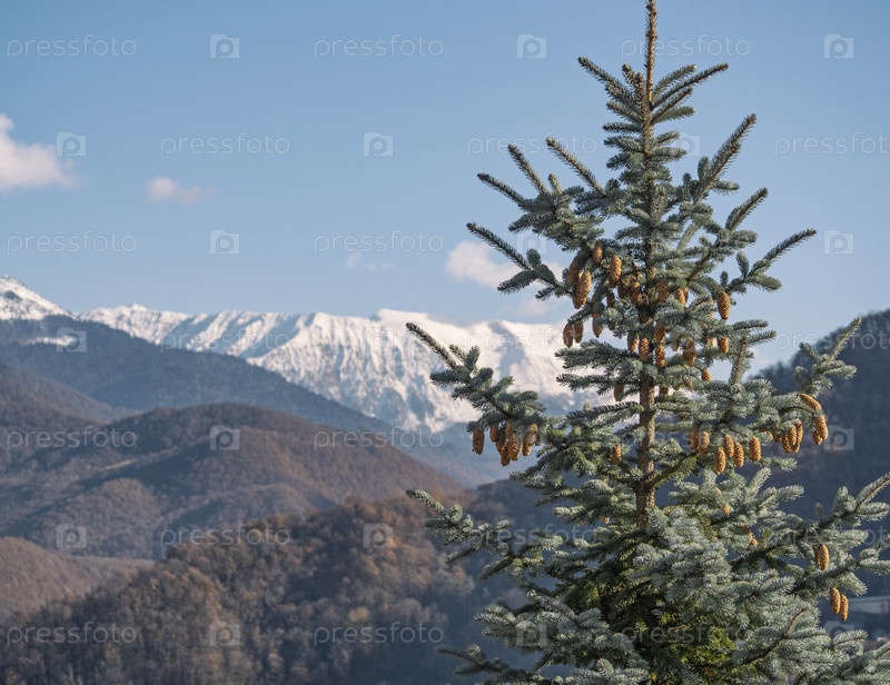 Сосна с конусами на заснеженных горах и фоне синего неба