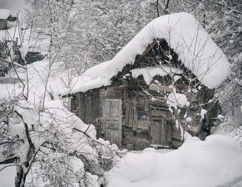 Старый деревянный дом, покрытый снегом.Зимний сельский пейзаж