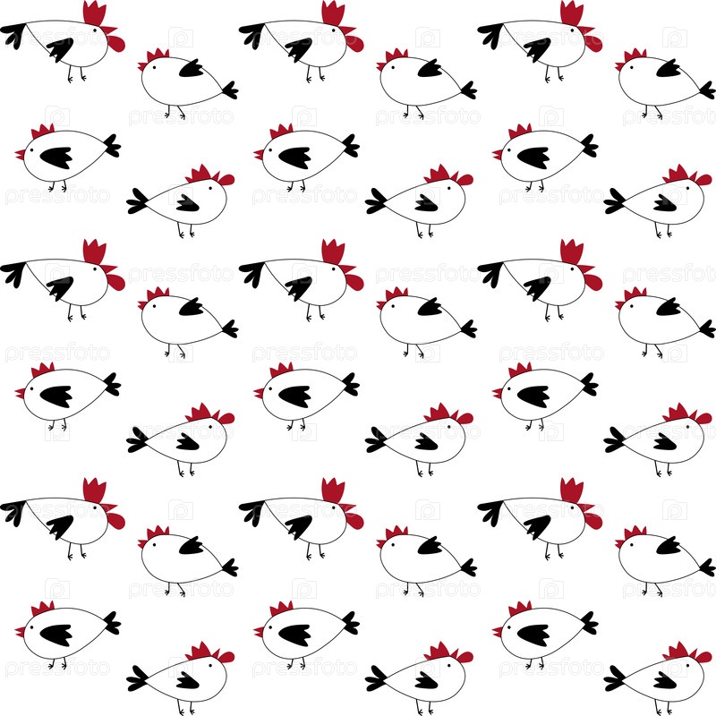 Минималистский бесшовный рисунок со стилизованными цыплятами и петухами в сетке
