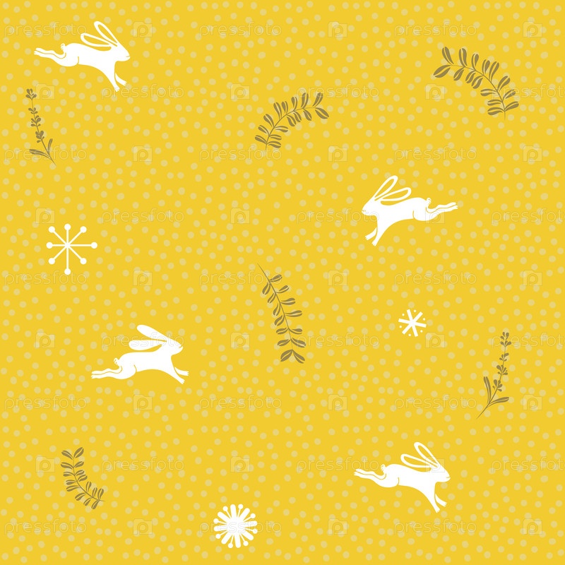 Игральный бесшовный растровый рисунок с белыми прыгающими кроликами на ярко-желтом фоне