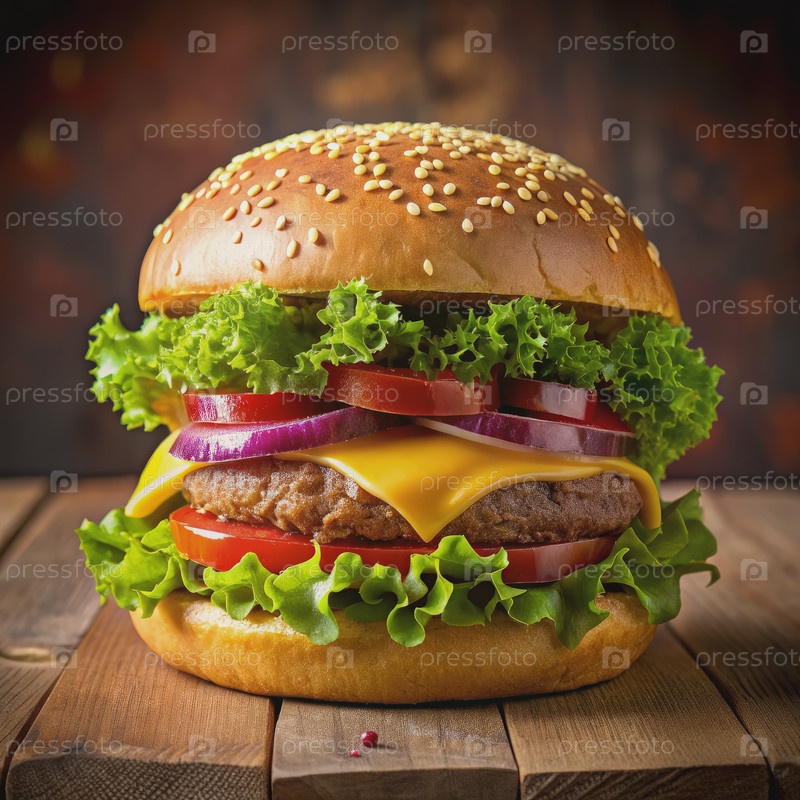 Близость сочного чизбургера с салатами, помидорами и луком на деревянном столе