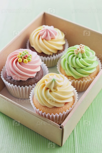 Четыре красочные кексы в коробке на зеленом столе
