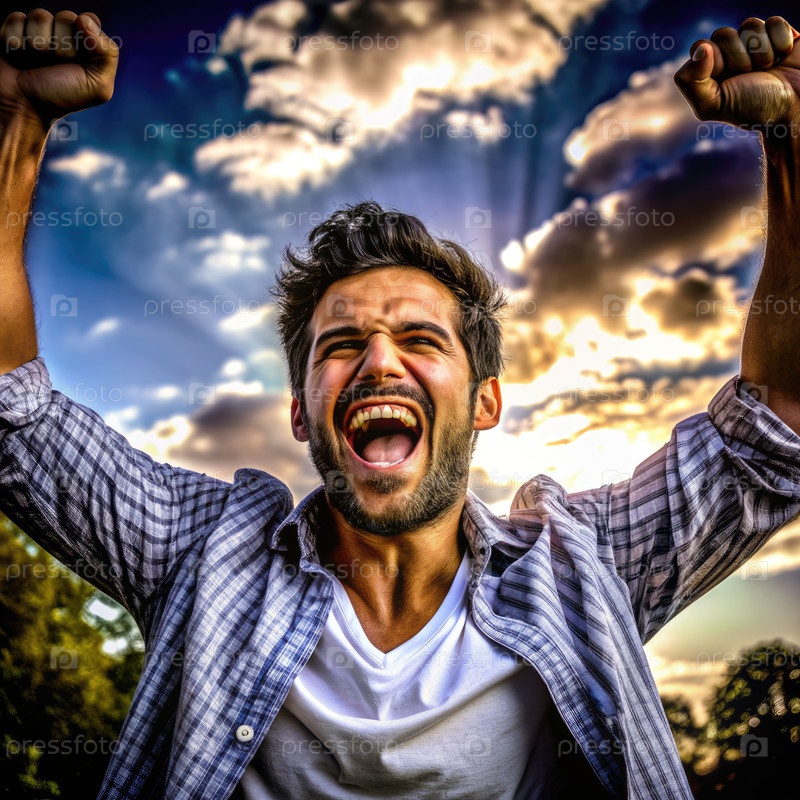 Взволнованный молодой человек с поднятыми руками, празднующий в природе
