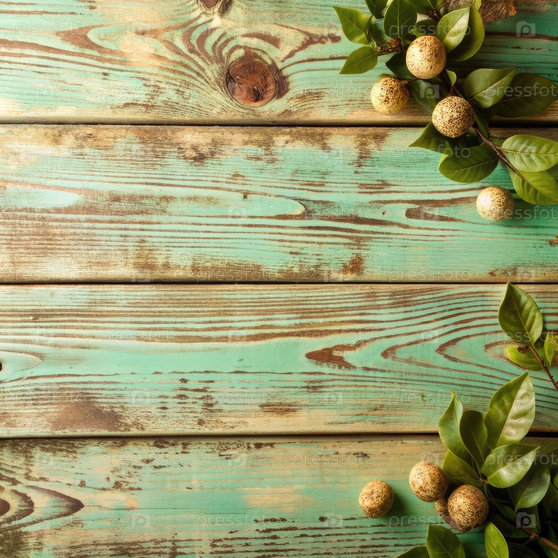 Рустичный зеленый деревянный фон с маленькими золотыми яйцами и зелеными листьями