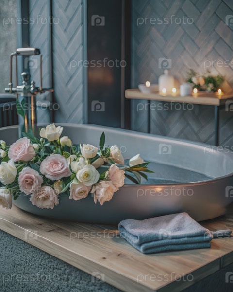 Ванная комната с цветочной ванной и полотенцем. генеративный современный ИИ