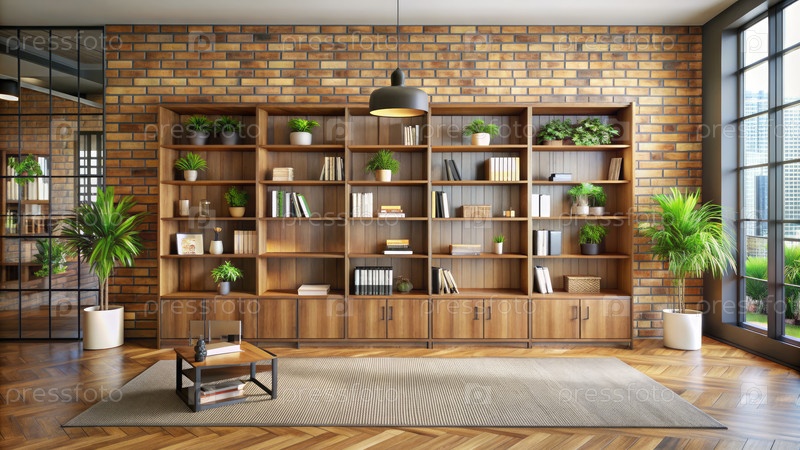 Жилая комната на чердаке с большим книжным шкафом и кирпичной стеной