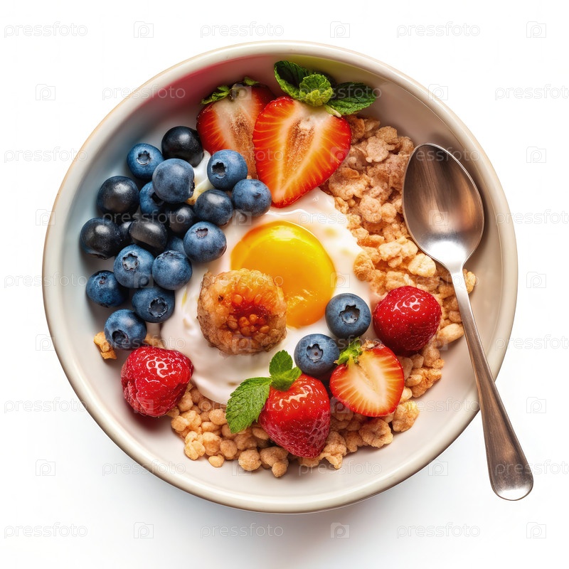 Подарок из зерновых, йогурта, фруктов и яиц на завтрак