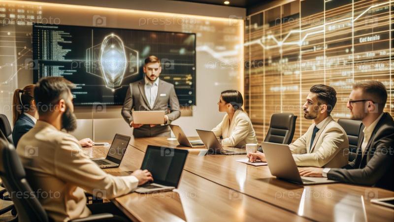 Бизнес-профессионалы собираются для презентации технологий в современном офисе