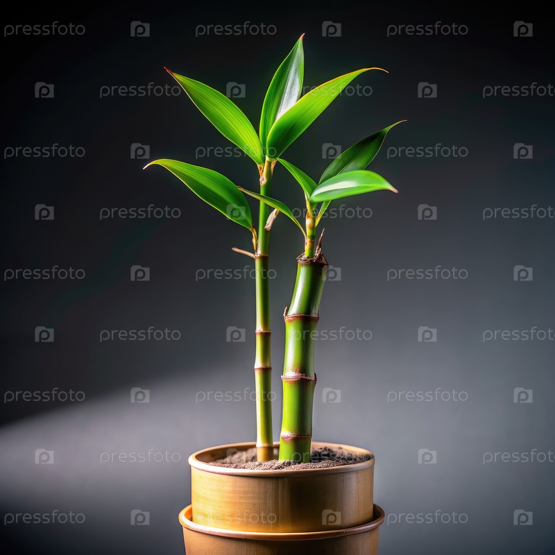 Одно растение бамбука с зелеными листьями в коричневом горшке на сером фоне