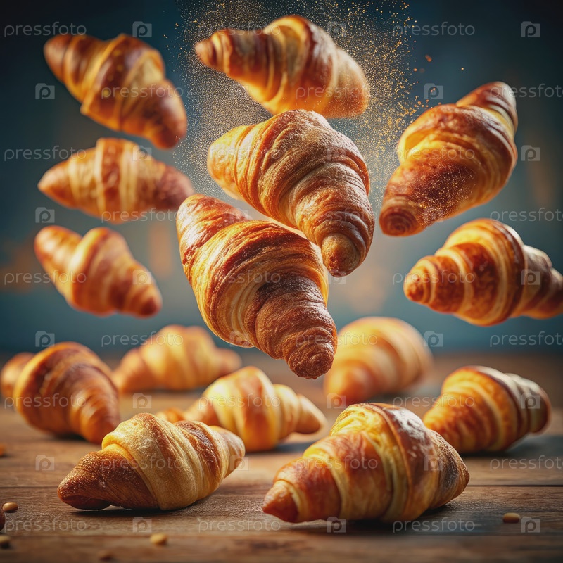Свежевыпеченные кроассанты падают на деревянный стол на синем фоне