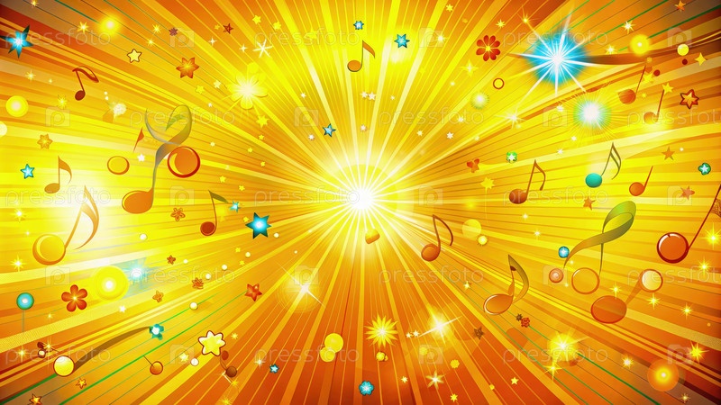 Красочные музыкальные ноты и звезды на фоне золотых лучей