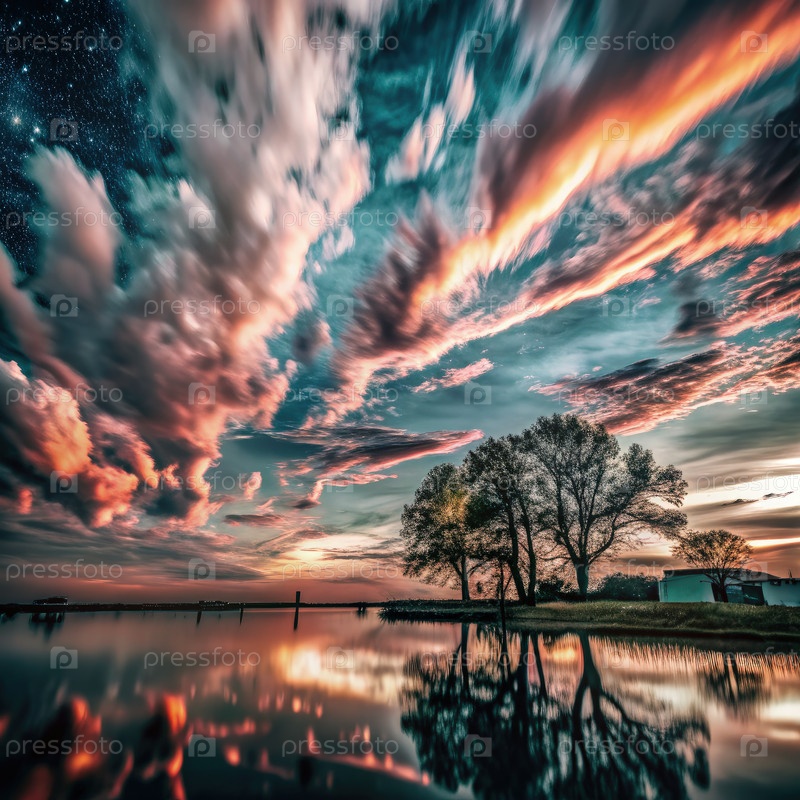 Живое закатное небо с звездной ночью над силуэтными деревьями и спокойной водой