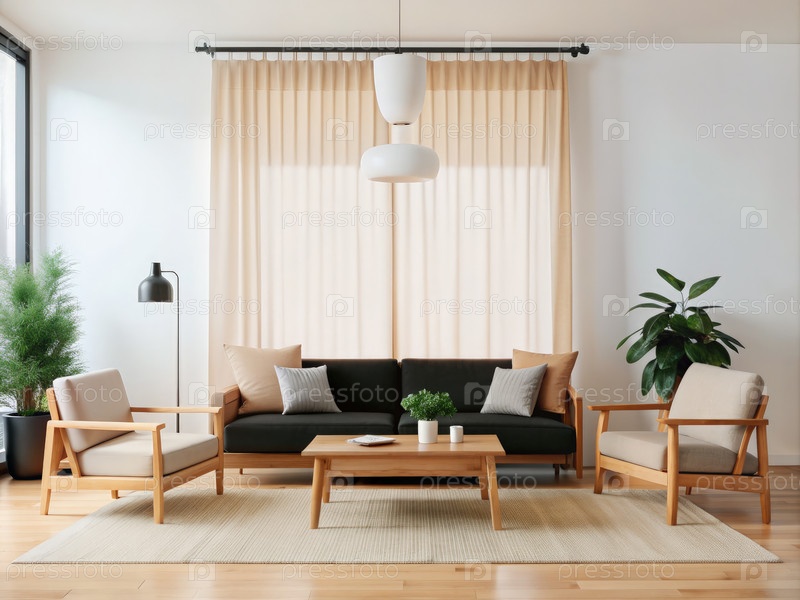 Минималистская гостиная с деревянной мебелью и теплыми цветами