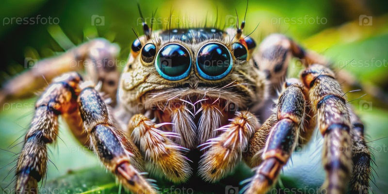 Ближайшее изображение прыгающего паука с голубыми глазами на зеленом листе