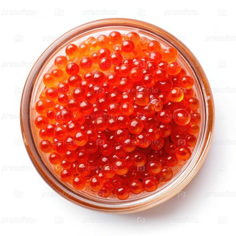 Главный вид красной икры в стеклянной миске на белом фоне