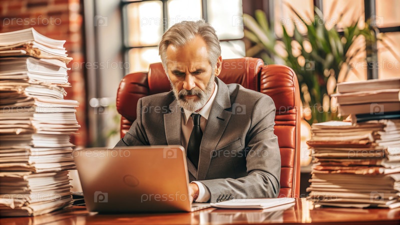Старший руководитель работает на ноутбуке в офисе со стеками документов. генеративный ИИ