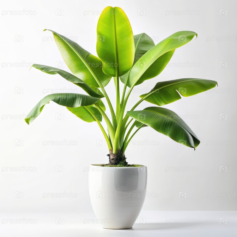 Роскошное зеленое банановое растение в белой вазе на белом фоне