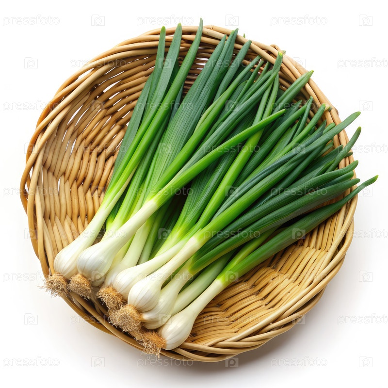 Свежие зеленые луковицы в корзине из смолы на белом фоне