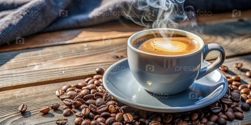 Свежеприготовленный кофе, испаряющийся на деревянной столешнице