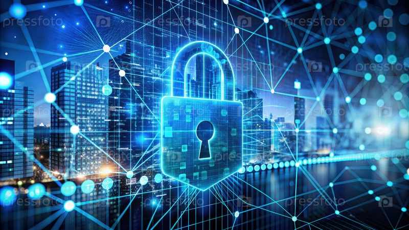 Цифровой замок безопасности, защищающий городской пейзаж ночью. генеративный ИИ