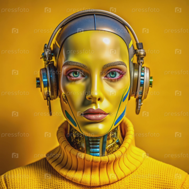 Abstract Аватар искусственного интеллекта, носящий наушники на желтом фоне