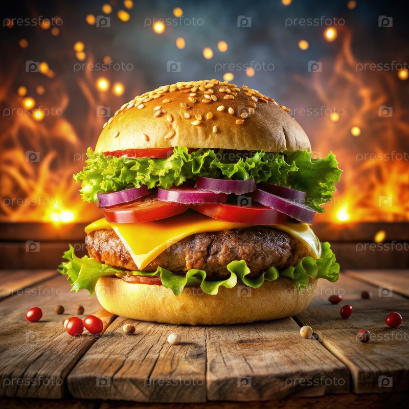 Вкусный чизбургер на деревянном столе с огненным фоном