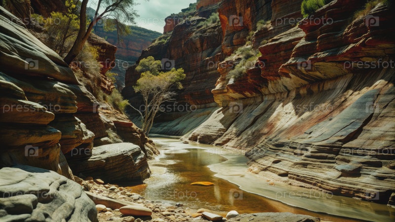 Узкое пустынное ущелье с красными песчаниками и безмятежным ручкой