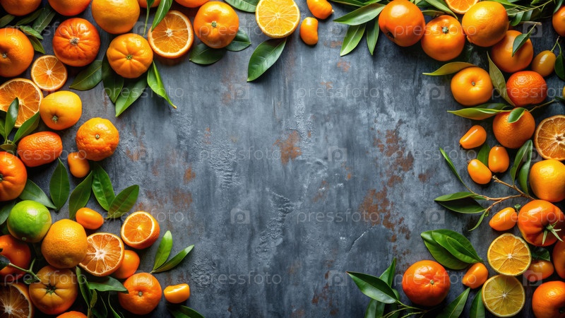 Свежие мандарины и цитрусовые фрукты расположены на серой поверхности