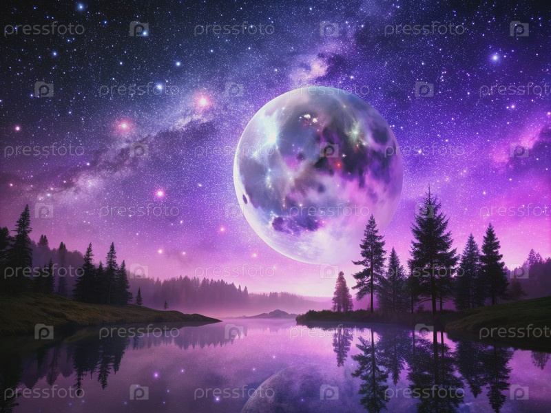 Ночной пейзаж полнолуния с силуэтными сосновыми деревьями и отражающим озером