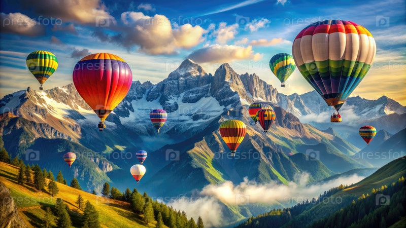 Горячие воздушные шары взлетают над величественными горными вершинами