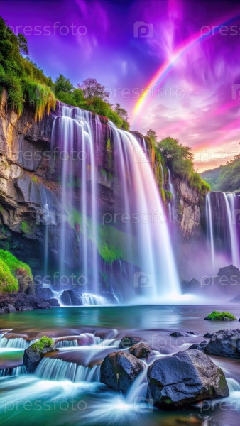 Величественный водопад с радугой и утренним небом