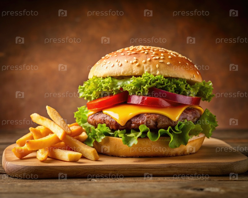Сочный чизбургер и хрустящие картофель на деревянной доске. генеративный ИИ