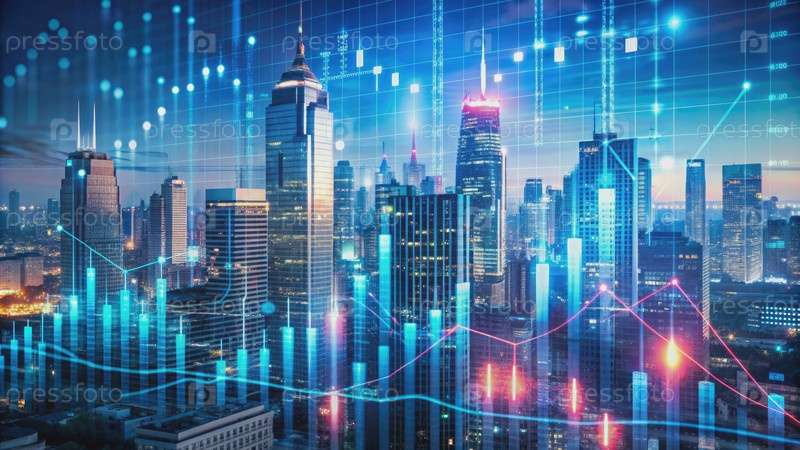 Горизонт футуристического финансового района с сияющими цифровыми накладками данных. генеративный ИИ
