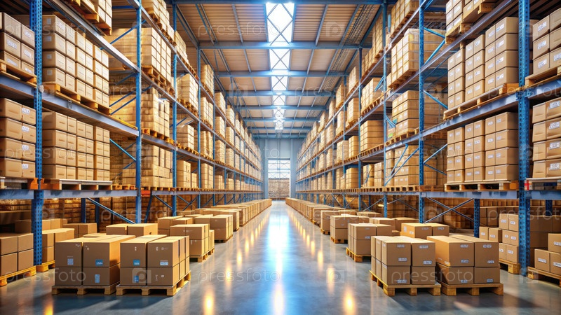 Вид от первого лица на оживленный склад, заполненный картонными коробками