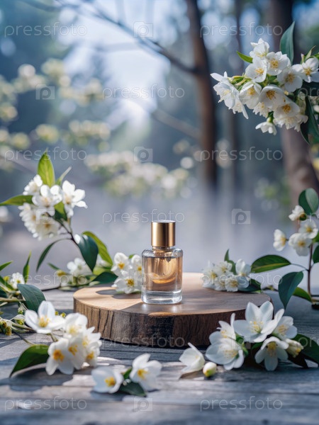 Стеклянная бутылка парфюмерии, окруженная белыми цветами в летнем лесу