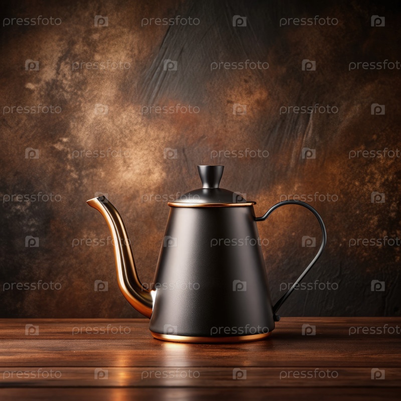 Кетл с золотой отделкой на деревянном столе на коричневом фоне