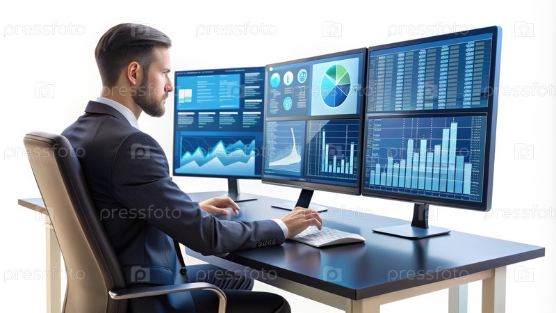 Финансовый аналитик, работающий с данными на нескольких компьютерных мониторах в офисе