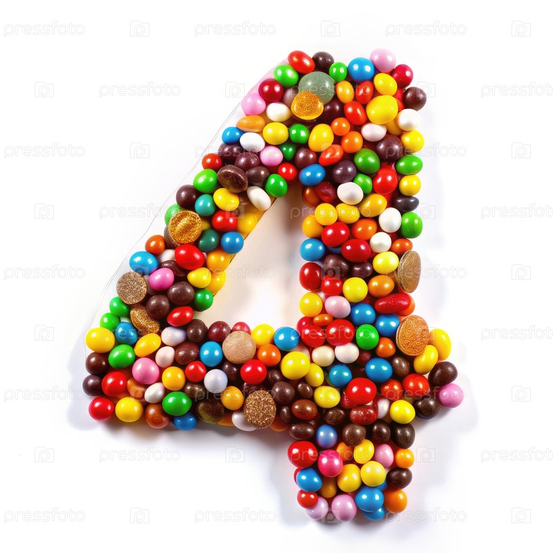 Цветные конфеты номер четыре на белом фоне