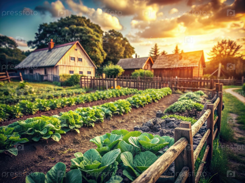 Сад в дворе фермы на закате с деревянным забором и рядами овощей