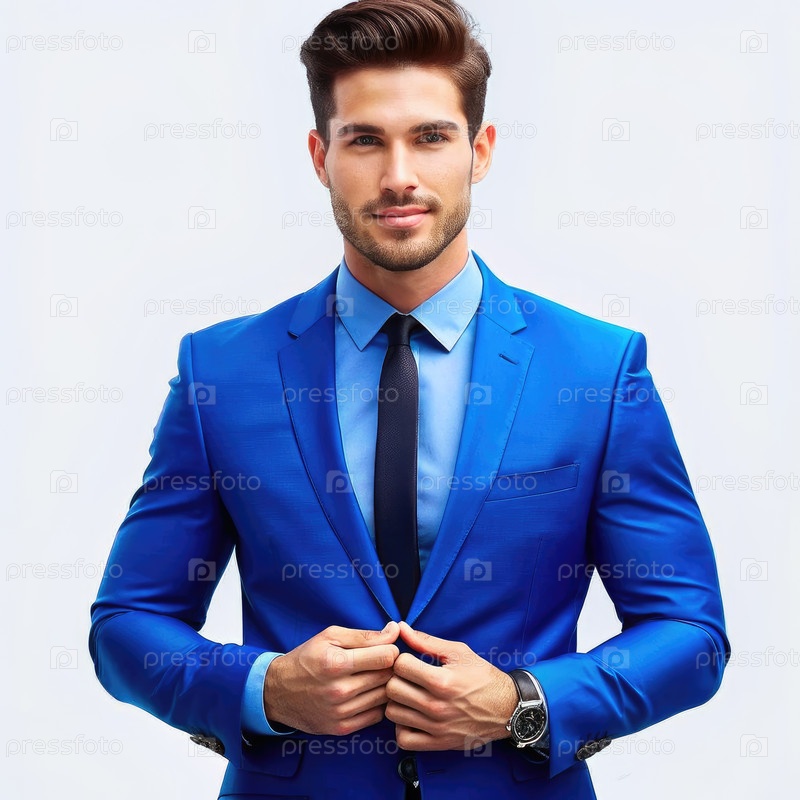 Красивый бизнесмен в синем костюме корректирует свою куртку
