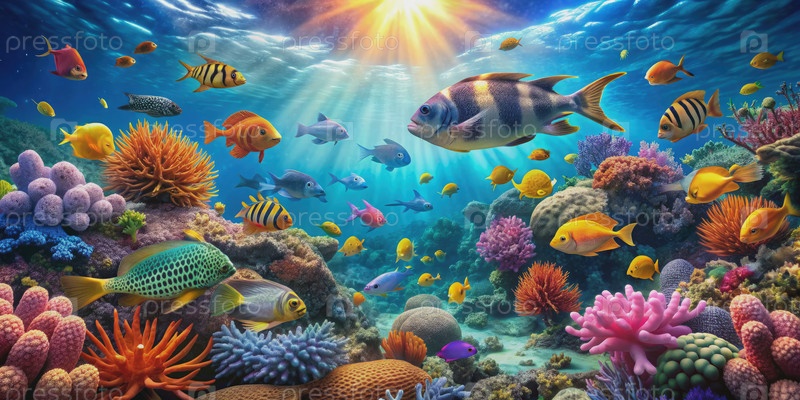 Вибрирующие рифовые рыбы плавают в солнечном коралловом рифе