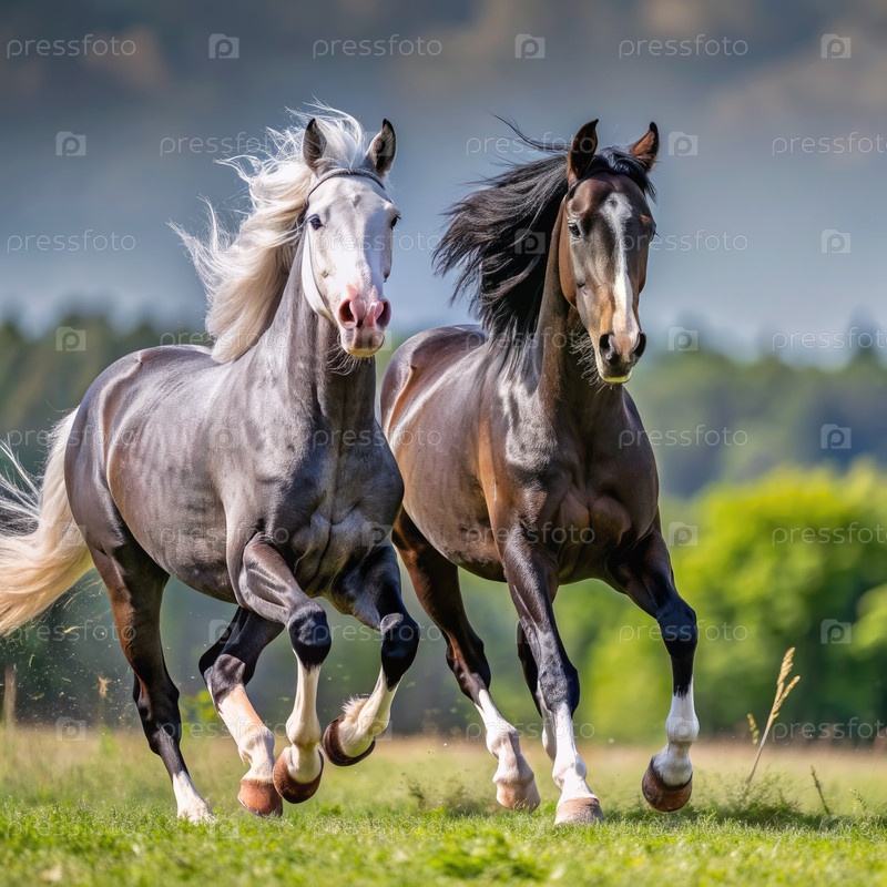 Две лошади, бегущие по зеленой лужайке в солнечный день