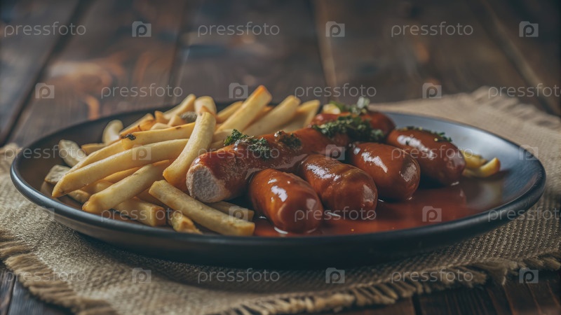 Ближайшее изображение немецкого карривурста с картофелем на черной тарелке