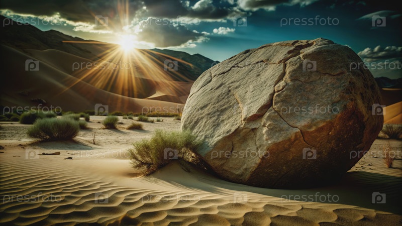 Большой, треснувший валун отдыхает в пустынном пейзаже на закате