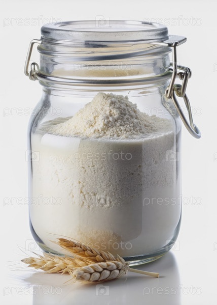 Стеклянная банка, наполненная белой мукой и пшеничными шипами на белой поверхности