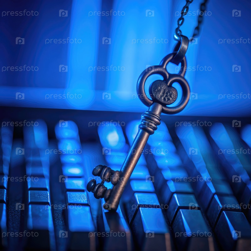 Старый ключ лежит на клавиатуре с голубым подсветкой