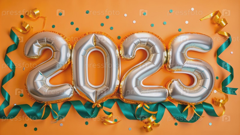 Серебряные 2025 воздушных шаров с зелеными и золотыми лентами на оранжевом фоне