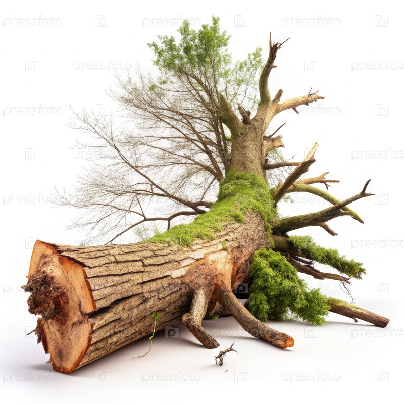 Ствол упавшего дерева с мохом и ветвями на белом фоне